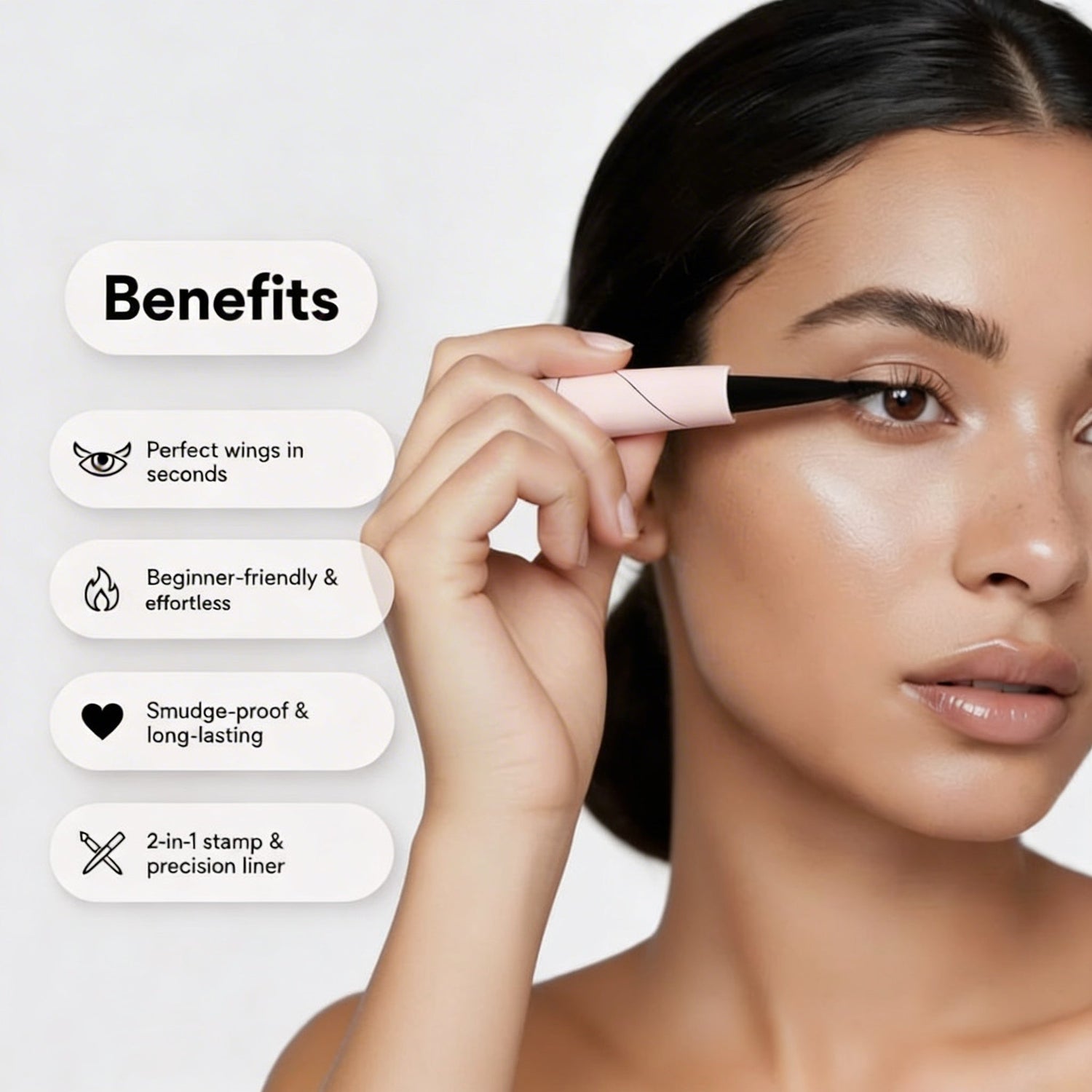 A dual sided wing stamp designed to create sharp, balanced eyeliner in seconds with zero guesswork.